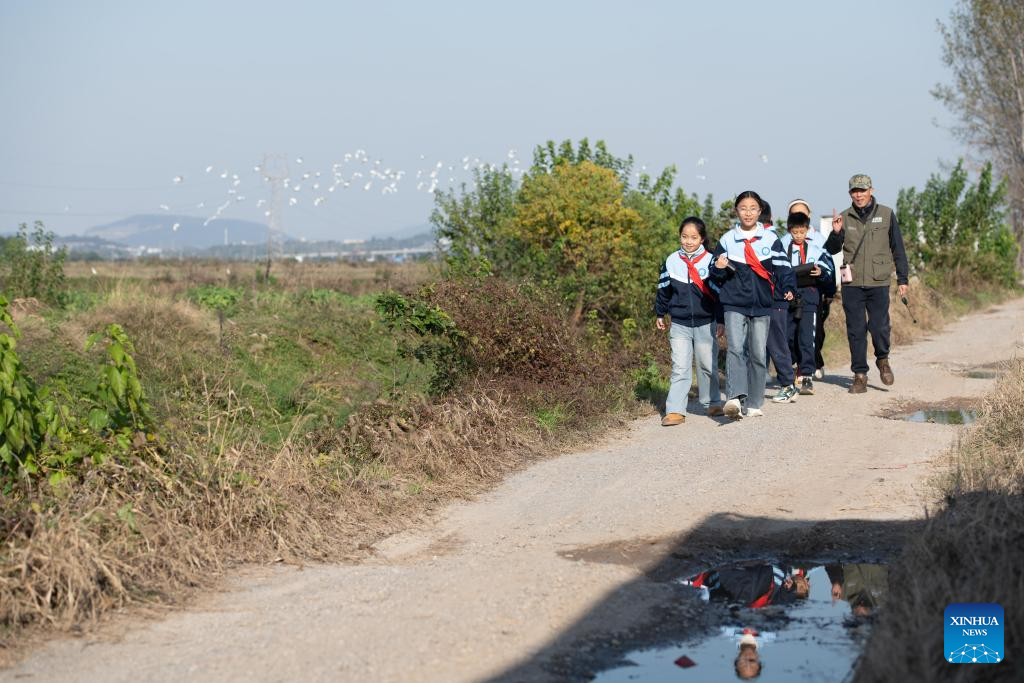 A flock of egrets flies behind as students of Maotan Primary School observe birds under the guidance of a wild bird conservation volunteer at the Shibasuo provincial nature reserve in Chizhou City, east China's Anhui Province, Nov. 18, 2025. (Xinhua/Zhang Duan)