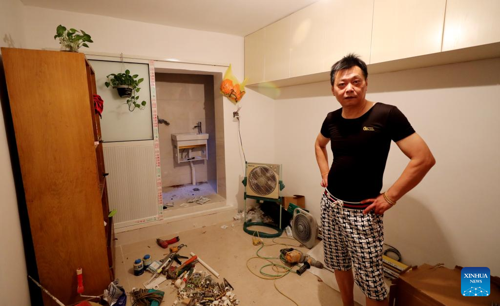 This file photo taken on July 18, 2019 shows a resident standing at his home where the toilet renovation is under way, in east China's Shanghai. (Xinhua/Fang Zhe)