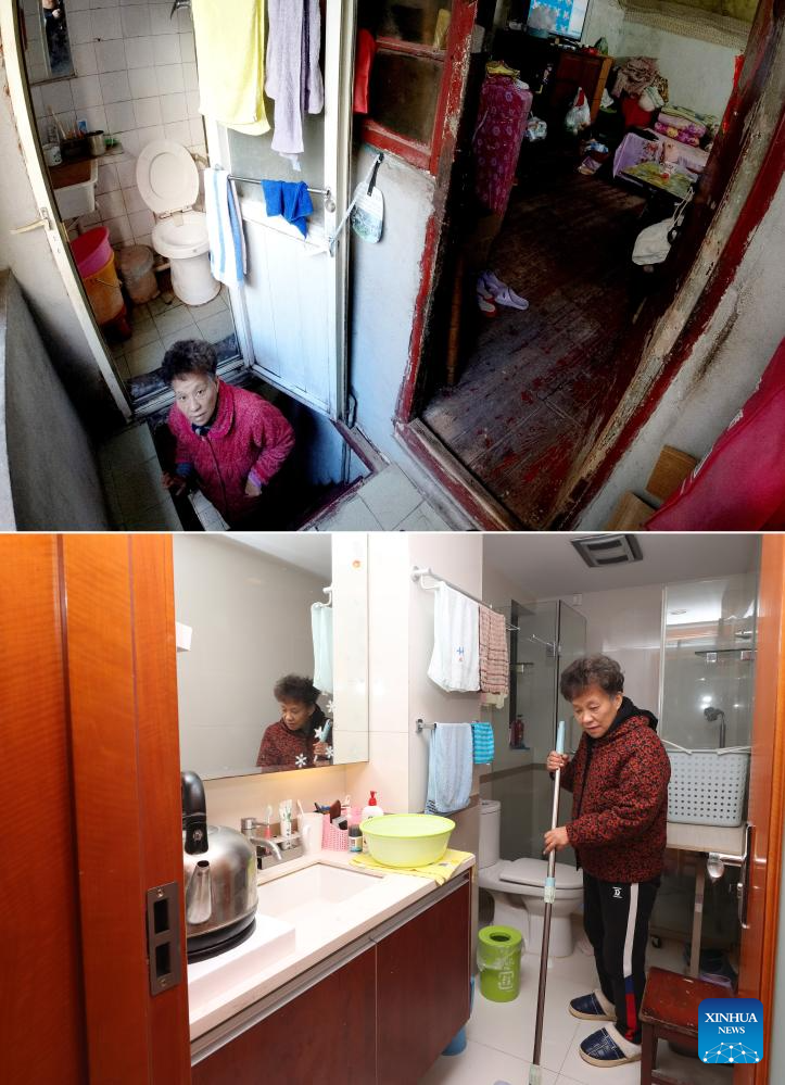 This combo photo shows a resident at her old house in Yangpu District where the toilet accommodating only for one person, on Dec. 9, 2020 (above), and she cleaning the bathroom floor at the relocated new house in Qingpu District of east China's Shanghai, Dec. 30, 2020 (below). (Xinhua/Fang Zhe)