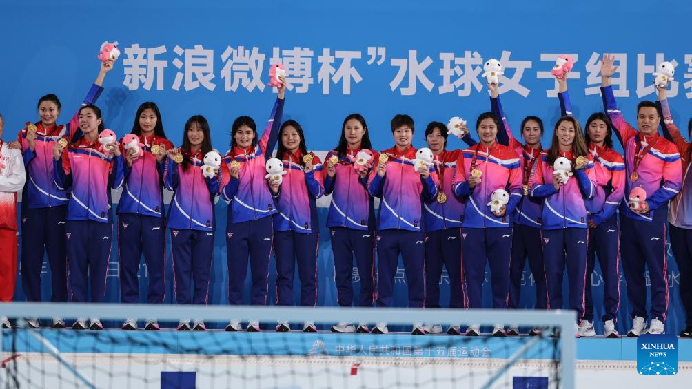 Gold medalists team Shanghai react during the awarding ceremony for the women's water polo at China's 15th National Games in Guangzhou, south China's Guangdong Province, Nov. 21, 2025. (Xinhua/Pan Yulong)