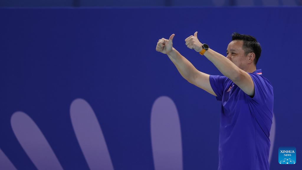 Li Wenhua, head coach of Shanghai, celebrates during the women's water polo final between Shanghai and Tianjin at China's 15th National Games in Guangzhou, south China's Guangdong Province, Nov. 21, 2025. (Xinhua/Pan Yulong)