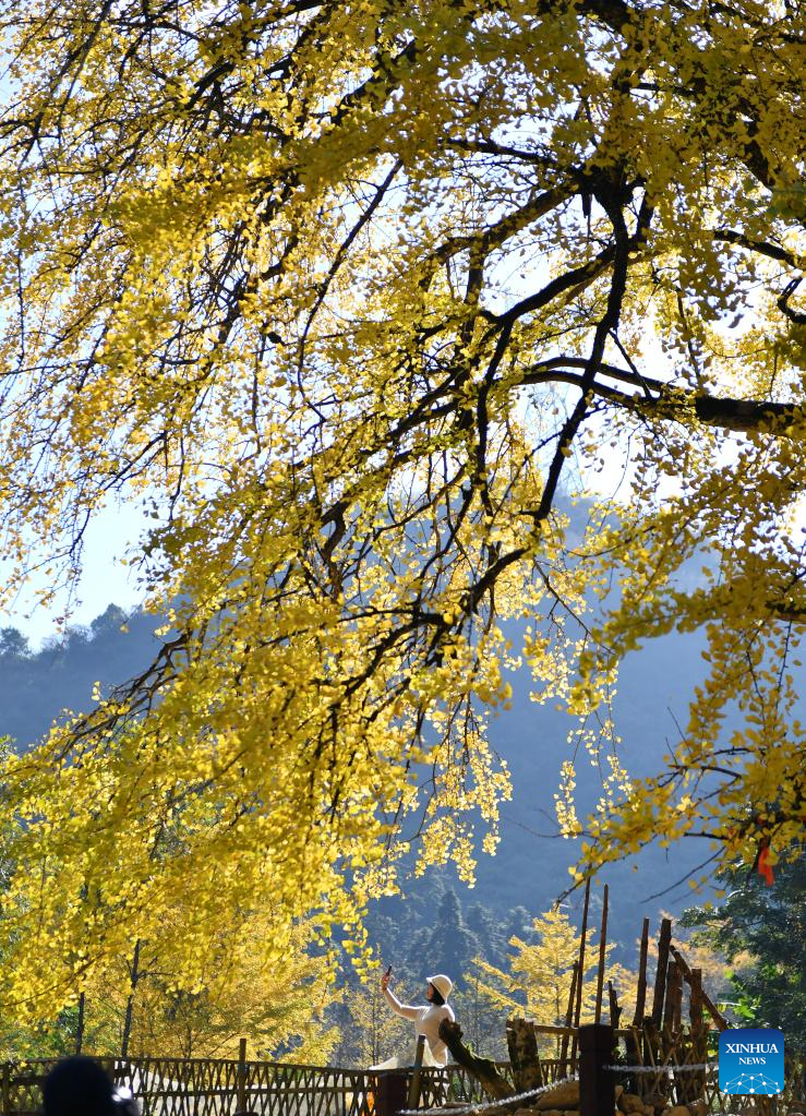 A visitor takes a selfie under a ginkgo tree in Tongziao Village, Shuangpai County, Yongzhou City, central China's Hunan Province, Nov. 23, 2025. More than 3,000 ginkgo trees here have gradually turned golden, attracting a lot of tourists. (Xinhua/Zhao Zhongzhi)