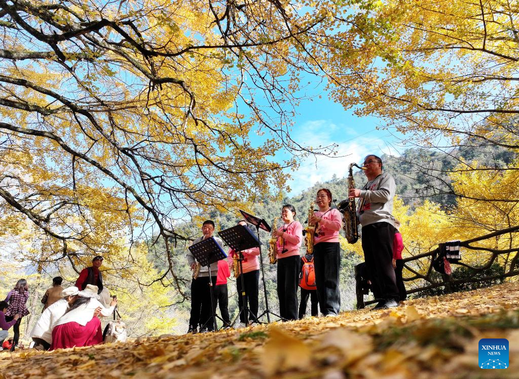 People play the saxophones under ginkgo trees in Tongziao Village, Shuangpai County, Yongzhou City, central China's Hunan Province, Nov. 23, 2025. More than 3,000 ginkgo trees here have gradually turned golden, attracting a lot of tourists. (Xinhua/Zhao Zhongzhi)
