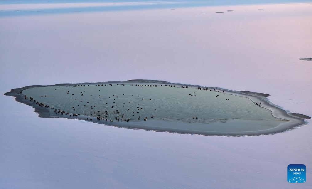 An aerial drone photo taken on Nov. 27, 2025 shows mallards resting on the Harbin section of Songhua River in northeast China's Heilongjiang Province. (Photo by Zhang Shu/Xinhua)