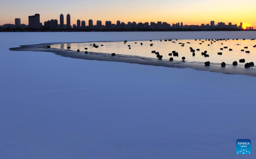 A drone photo taken on Nov. 27, 2025 shows mallards resting on the Harbin section of Songhua River in northeast China's Heilongjiang Province. (Photo by Zhang Shu/Xinhua)