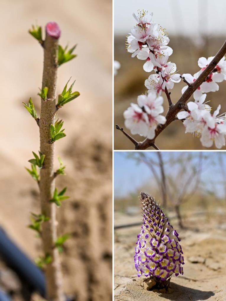 This combo photo shows a rose seedling (L) and cistanche (lower R) at sand-control model zones of Yutian County, Hotan Prefecture on April 8, 2025, and apricot blossoms in Baicheng County, Aksu Prefecture on April 12, 2025 (upper R) in northwest China's Xinjiang Uygur Autonomous Region. (Xinhua/Ding Lei)