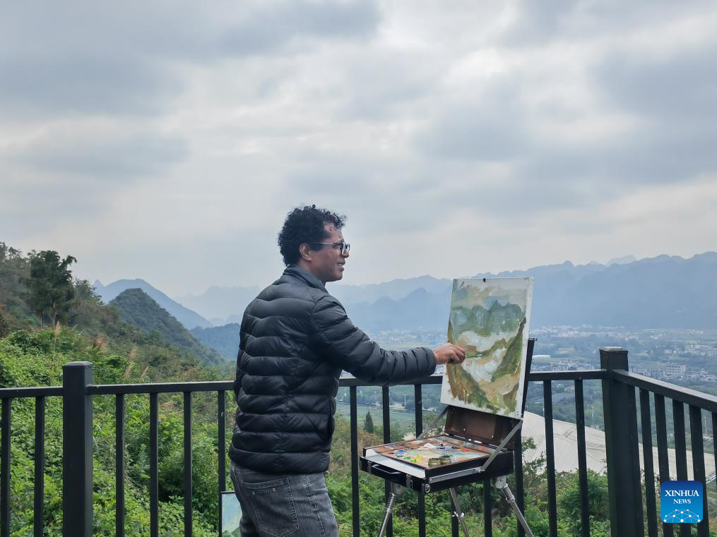 This mobile phone photo taken on Nov. 20, 2025 shows Berhane Tsegeyohannes from Eritrea, an art teacher at Minzu Normal University of Xingyi, painting a picture at Wanfenglin scenic area in Xingyi City, southwest China's Guizhou Province. (Xinhua/Wu Si)
