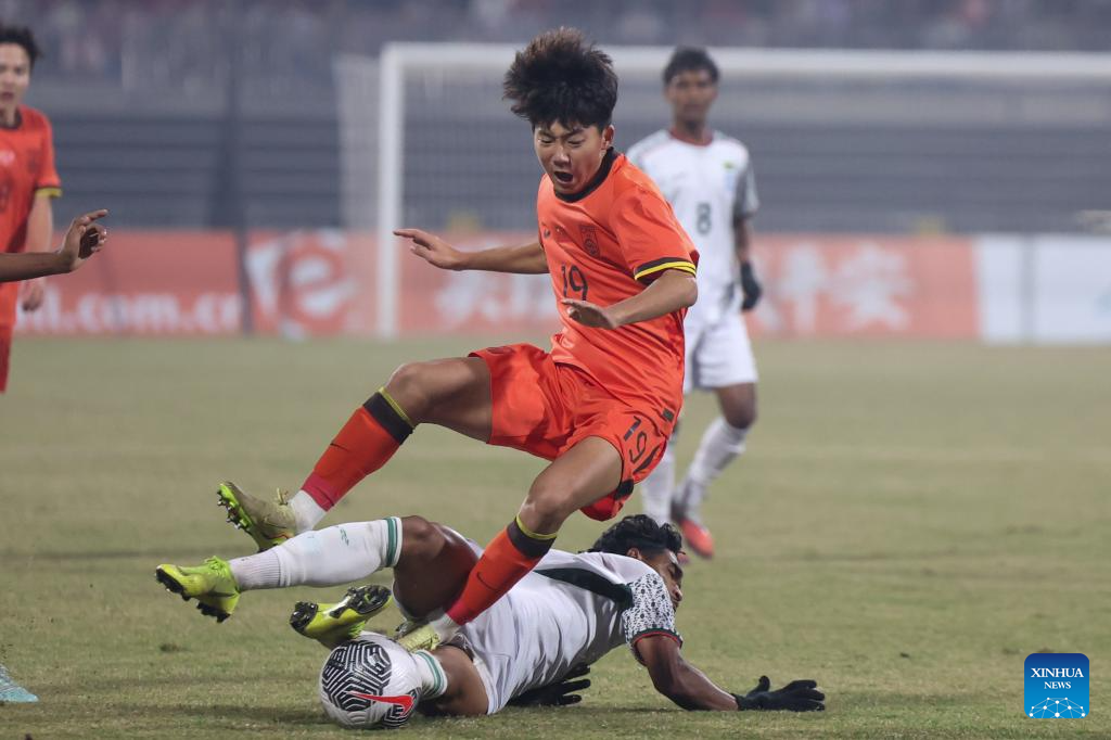 Wan Xiang (top) of China falls down during the AFC U17 Asian Cup 2026 Qualifier group A match between China and Bangladesh in southwest China's Chongqing Municipality, Nov. 30, 2025. (Xinhua/Huang Wei)