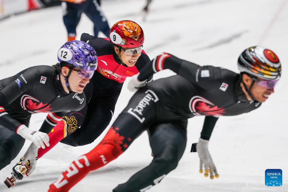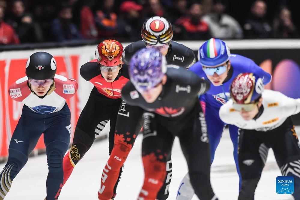 William Dandjinou (front L) of Canada competes during the men's 1500m final at the ISU Short Track World Tour #4 speed skating event in Dordrecht, the Netherlands, Nov. 29, 2025. (Xinhua/Peng Ziyang)