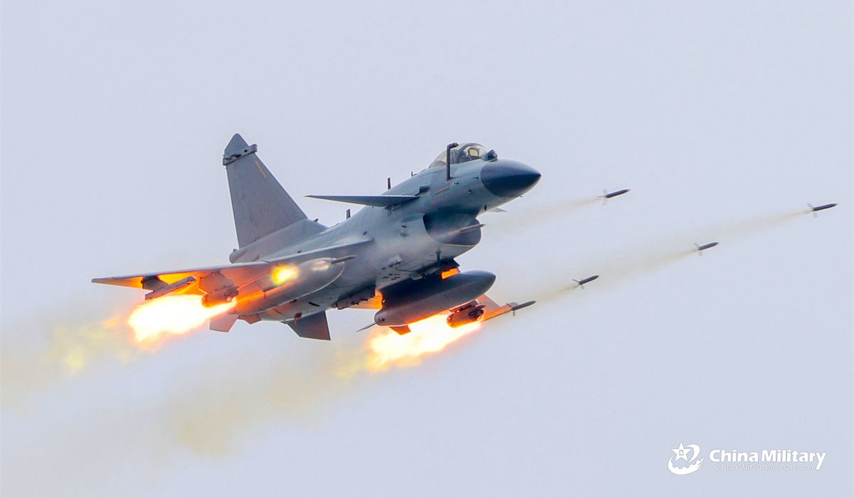 A J-10C fighter jet attached to an aviation unit with the air force under Chinese PLA Southern Theater Command fires rockets at ground target during a live-fire training exercise on November 12, 2025. (eng.chinamil.com.cn/Photo by Li Zishao)