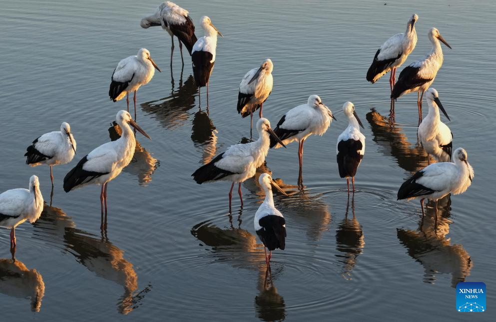 An aerial drone photo taken on Nov. 30, 2025 shows oriental white storks foraging on a coastal wetland in Tangshan, north China's Hebei Province. Coastal wetlands in the city of Tangshan are important habitats for migratory birds. (Xinhua/Yang Shiyao)