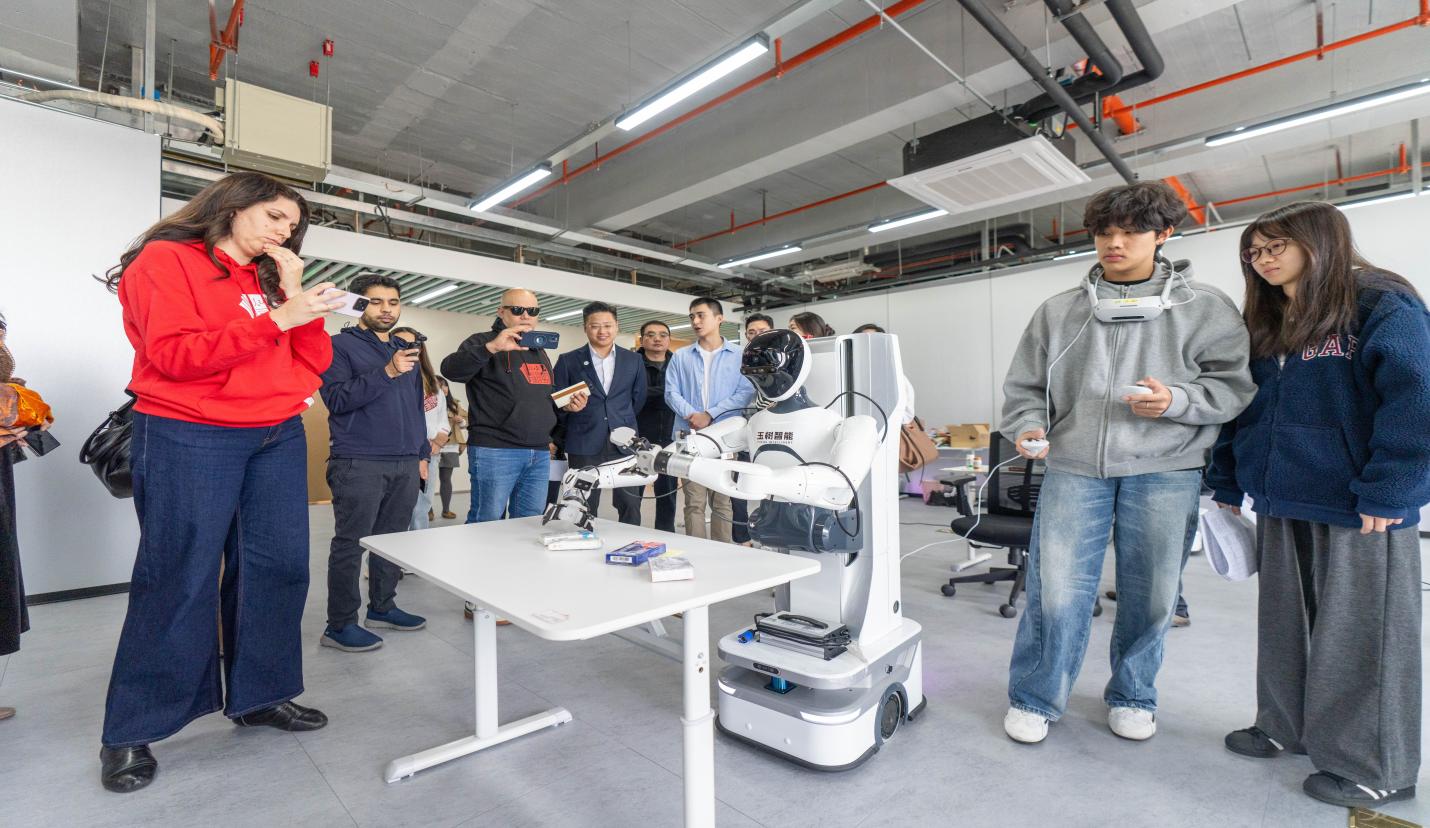 Wang Zi, founder and chairman of the World Robotics Alliance (WRA), engages with the media team during the tour at the Shenzhen Embodied Robotics Intelligent Innovation Center in Shenzhen, south China's Guangdong Province, Nov. 27, 2025. (People's Daily Online/Xu Zheng)
