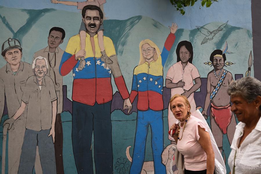 People walks past a mural in Caracas, Venezuela, Nov. 5, 2025. Venezuelan President Nicolas Maduro has repeatedly condemned Washington's actions as attempts to overthrow his government and expand the U.S. military influence in Latin America. (Photo by Marcos Salgado/Xinhua)