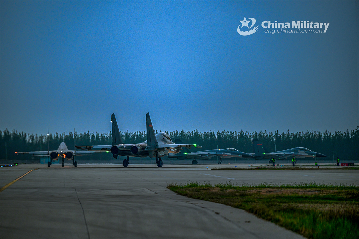 J-11 fighter jets attached to an aviation regiment under the Chinese PLA Air Force taxi on the runway during a round-the-clock training exercise in late November, 2025. (eng.chinamil.com.cn/Photo by He Wanli)