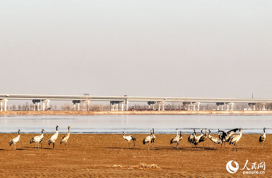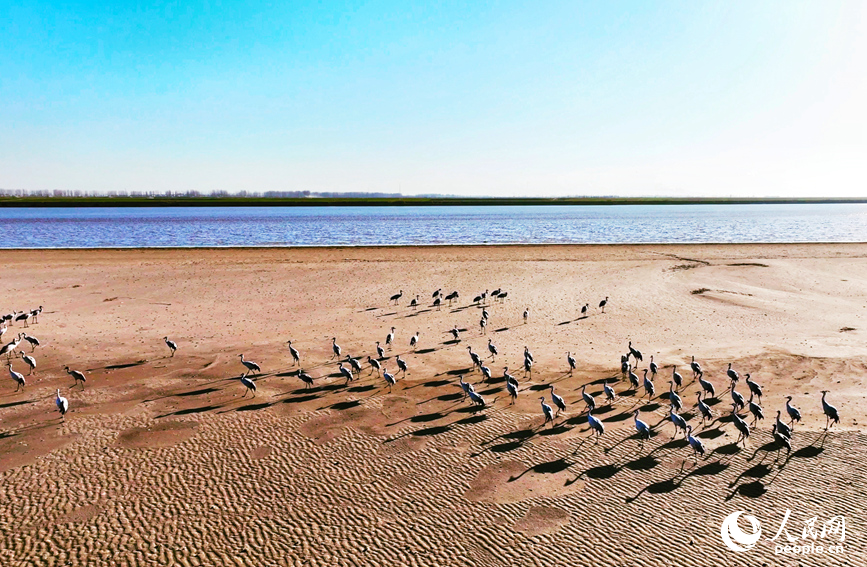 Photo shows common cranes strolling along the broad, sandy shores of the Yellow River in Fengqiu county, central China's Henan Province, Dec. 1, 2025. (People's Daily Online/Cheng Minghui)