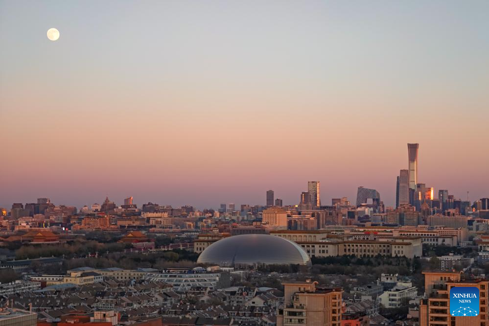 A full moon is pictured at the construction site of the Sun Island International Snow Sculpture Art Expo park in Harbin, northeast China's Heilongjiang Province, Dec. 4, 2025. This year's second-largest full moon to the eyes of lunar observers will appear on Friday morning, but the best viewing time falls on Thursday evening. (Photo by Zhang Shu/Xinhua)