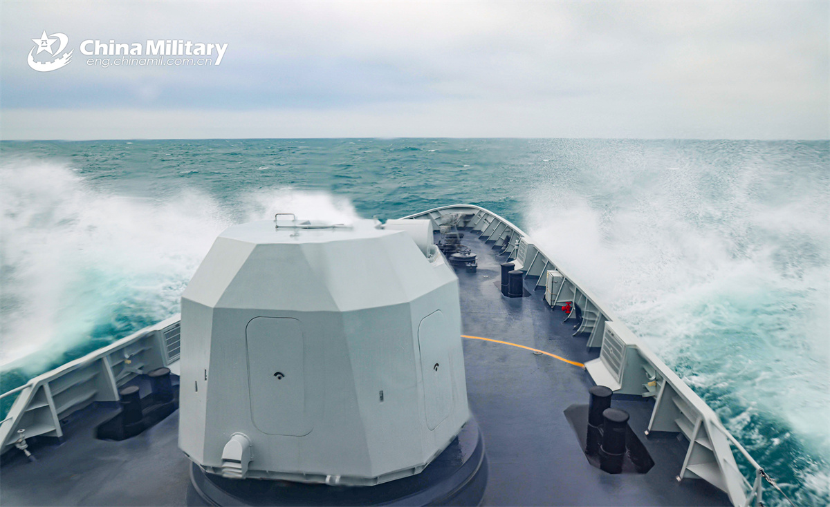 A warship attached to a frigate flotilla under the Chinese PLA Navy maneuvers at high speed during a maritime training exercise on November 27, 2025. (eng.chinamil.com.cn/Photo by Yang Haifan)