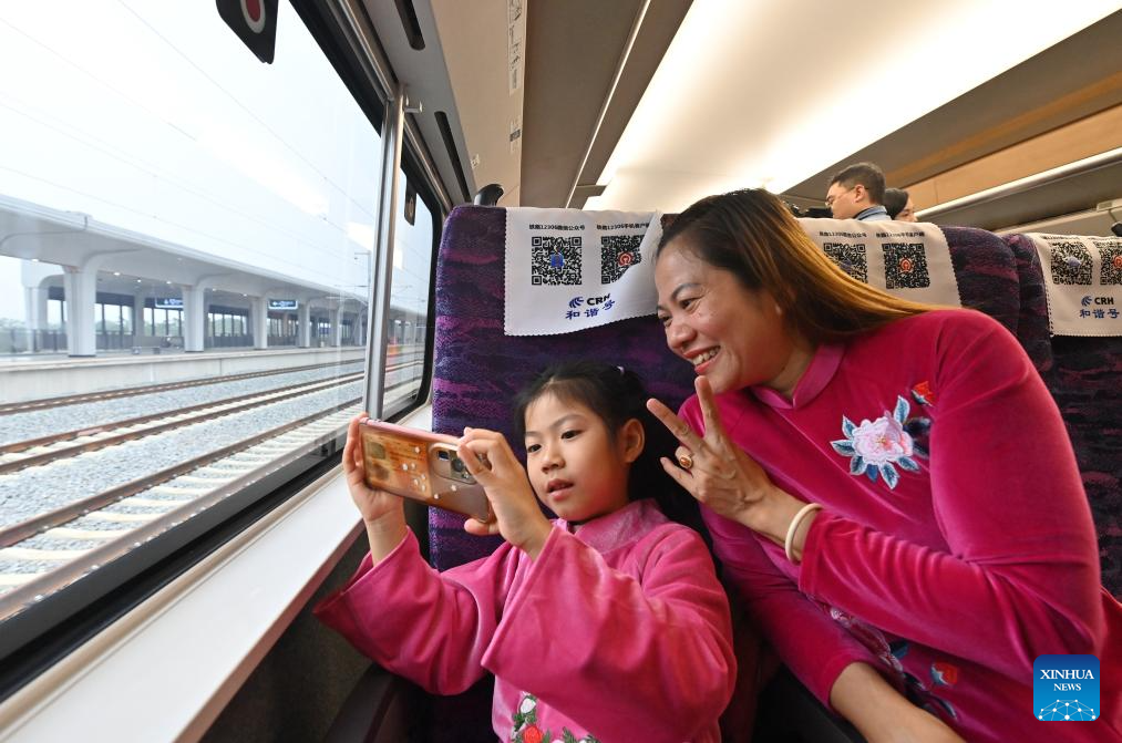 Tourists take selfies on a bullet train running from Pingxiang to Nanning in south China's Guangxi Zhuang Autonomous Region, on Dec. 5, 2025. The Chongzuo-Pingxiang section of the Nanning-Pingxiang Railway began operation on Friday, marking the full operation of the high-speed railway, which connects the region's capital city Nanning to the border city Pingxiang. (Xinhua/Lu Boan)