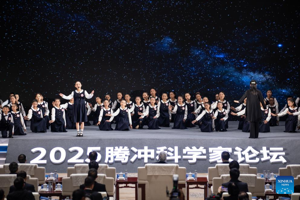 Students perform at the opening ceremony of Tengchong Scientists Forum 2025 in Tengchong City, southwest China's Yunnan Province, Dec. 6, 2025. The forum, attracting more than 120 academicians and over 70 presidents of well-known universities from home and abroad, opened here on Saturday. (Xinhua/Wang Anhaowei)