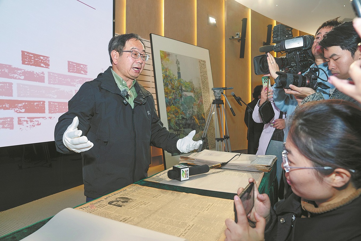 Chinese-American Lu Zhaoning introduces details of the new historical materials about the Nanjing Massacre at the Memorial Hall of the Victims in Nanjing Massacre by Japanese Invaders in Jiangsu province on Friday. LI BO/XINHUA