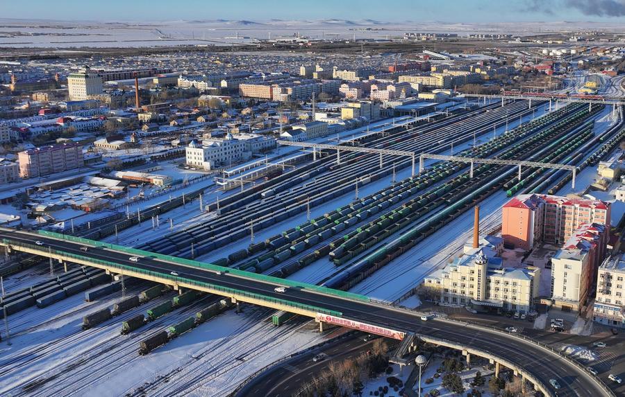 A drone photo taken on Dec. 10, 2025 shows China-Europe freight trains preparing to depart from the Manzhouli railway station in Manzhouli, north China's Inner Mongolia Autonomous Region. (Photo by Huang Xu/Xinhua)
