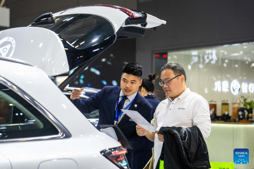 A visitor (1st R) learns about a car on display at the 21st Changsha International Automobile Expo in Changsha, central China's Hunan Province, on Dec. 10, 2025. The 6-day expo kicked off on Wednesday at the Changsha International Convention and Exhibition Center, showcasing some 1,000 vehicles from over 70 automobile brands. (Xinhua/Chen Sihan)