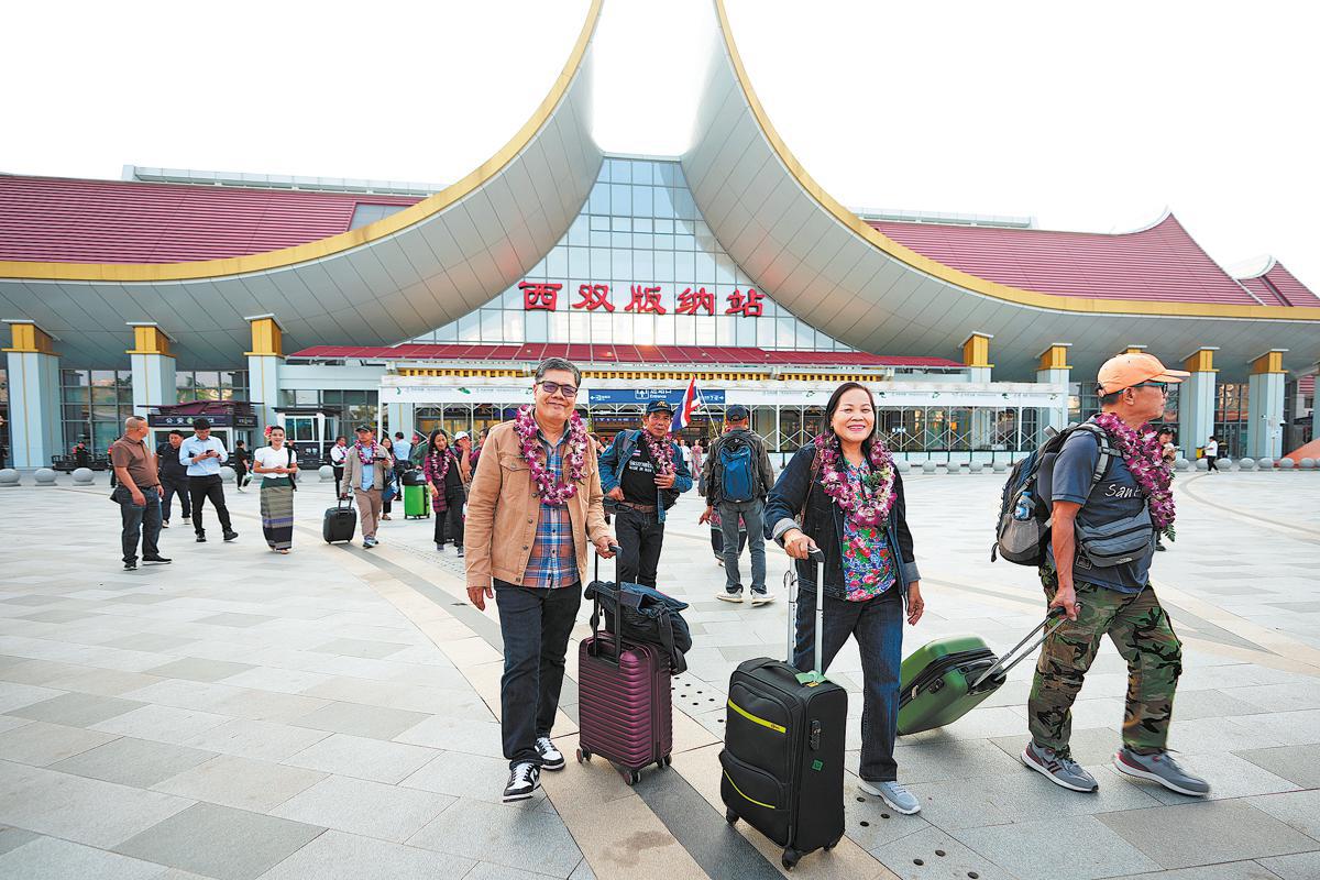 Tourists from Thailand and Laos exit Xishuangbanna Railway Station on the China-Laos Railway in Yunnan province on Feb 18. They are the first tour group to arrive after Xishuangbanna offered visa-free entrance to tour groups from ASEAN member states. CHEN XINBO/XINHUA