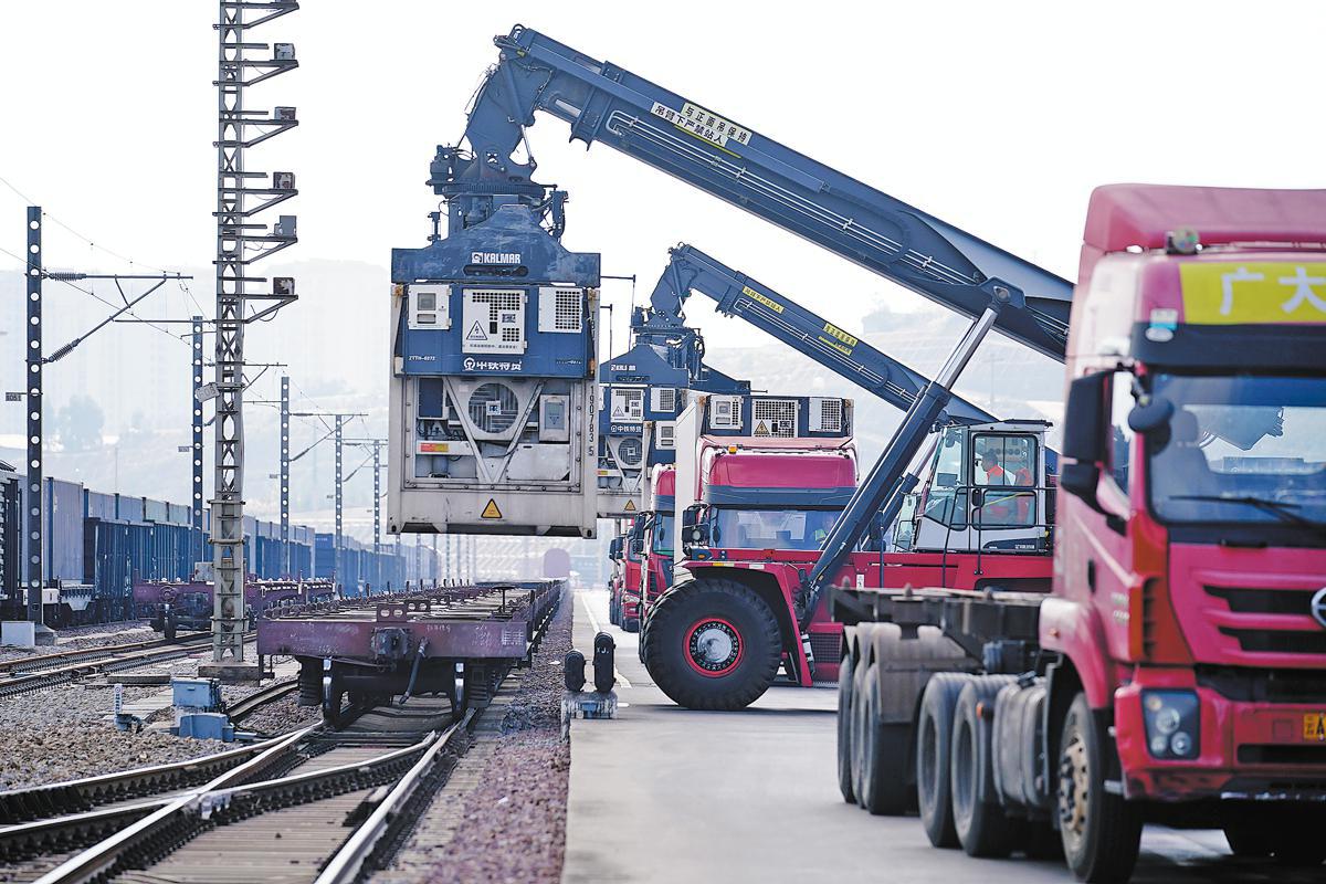 Cold-chain containers are loaded onto a train of the China-Laos freight service in Kunming, Yunnan province, on Jan 2. LIU RANYANG/CHINA NEWS SERVICE