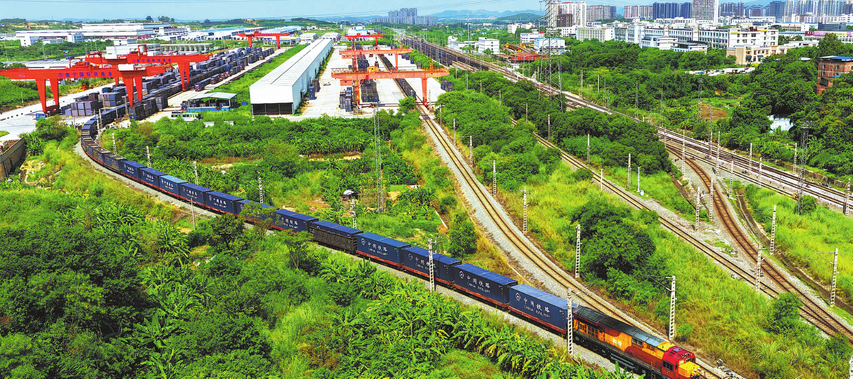 A China-Vietnam freight train departs from Nanning, Guangxi Zhuang autonomous region, on Sept 23. As of late October, a 143-percent year-on-year growth was logged on the number of containers transported through the service from Guangxi this year. XING GUANGLI/XINHUA