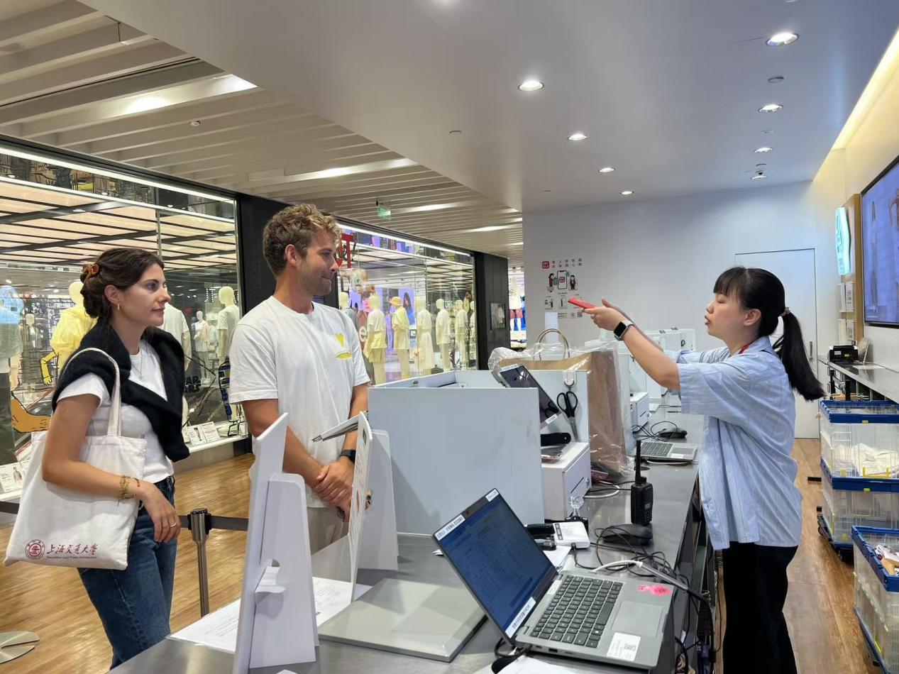 A Swiss tourist and his girlfriend apply for a departure tax refund at a flagship store of a renowned international fashion brand in Shanghai. (People's Daily/Tian Hong)
