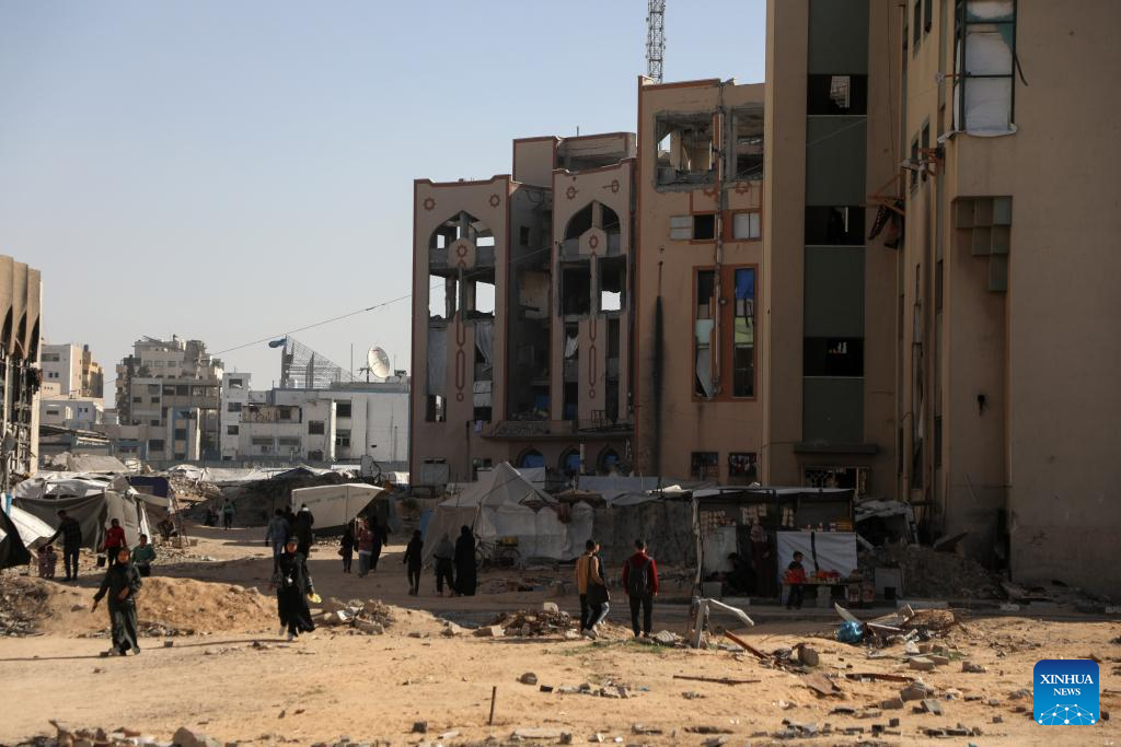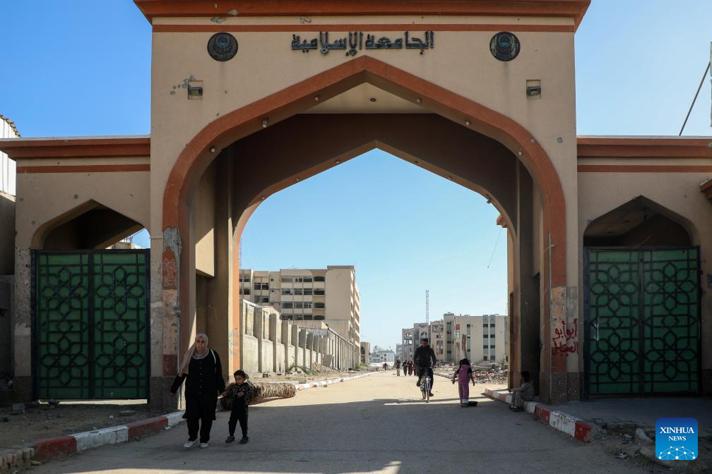 Palestinian students walk in the campus of Islamic University, in Gaza City, Dec. 7, 2025. (Photo by Rizek Abdeljawad/Xinhua)