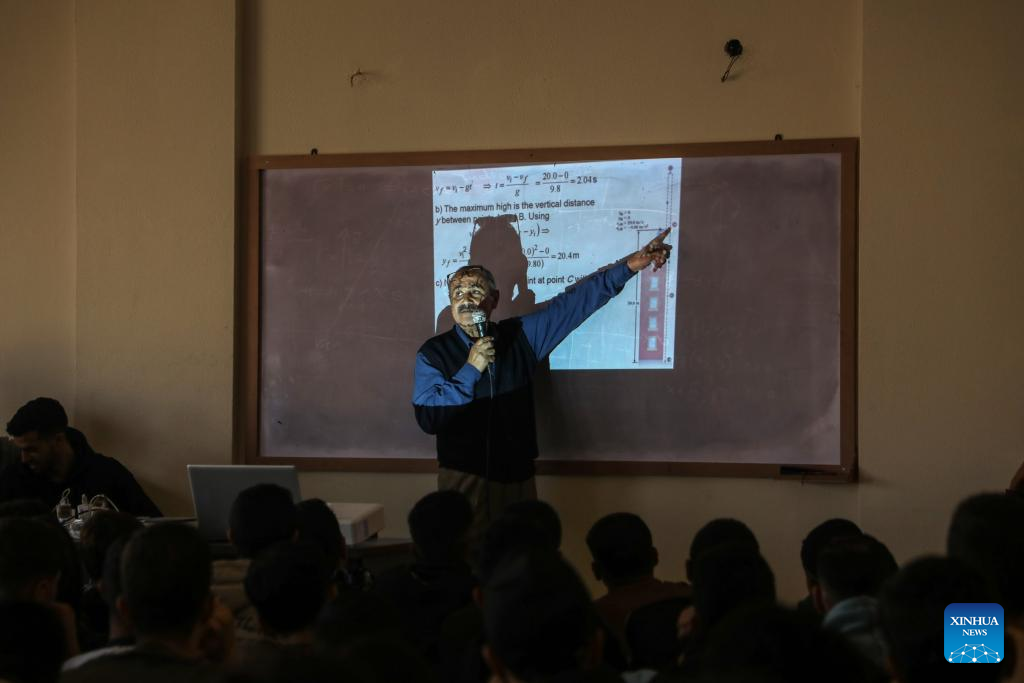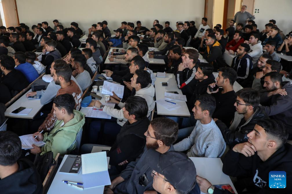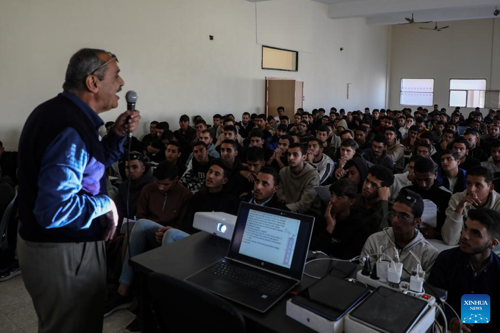 A teacher gives a lesson at Islamic University, in Gaza City, Dec. 7, 2025. (Photo by Rizek Abdeljawad/Xinhua)