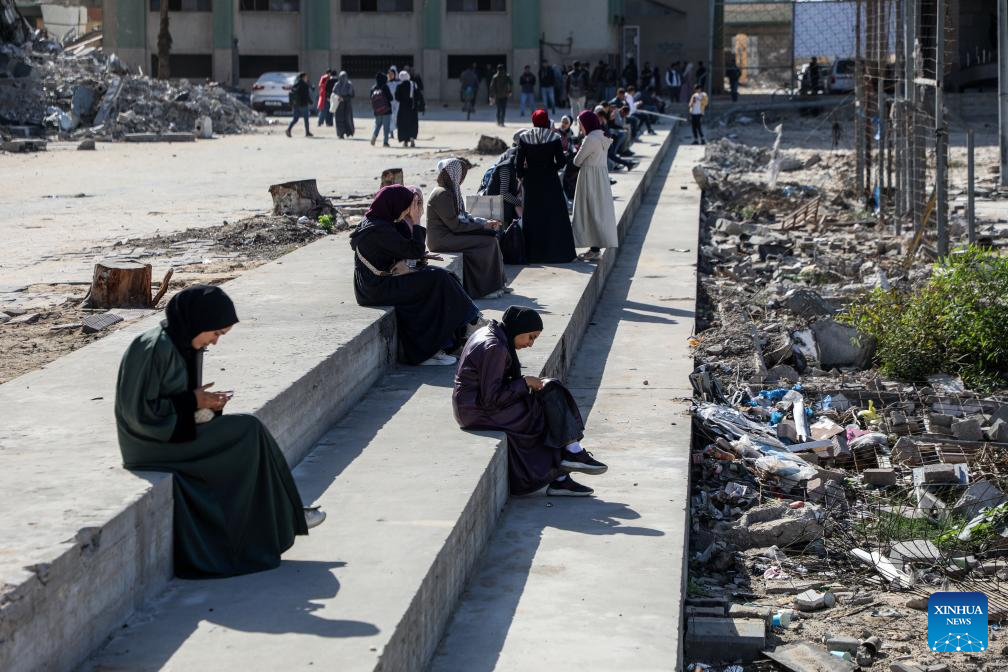 Palestinian students sit in the campus of Islamic University, in Gaza City, Dec. 7, 2025. (Photo by Rizek Abdeljawad/Xinhua)