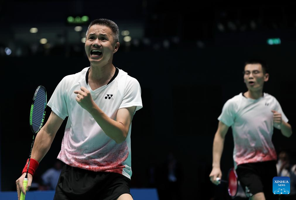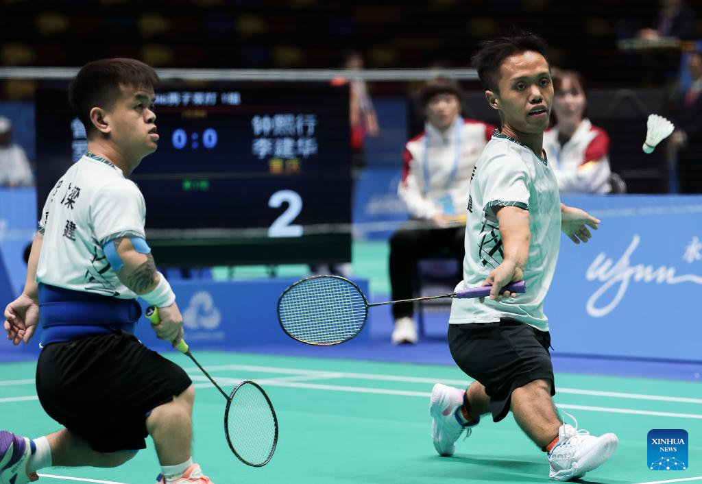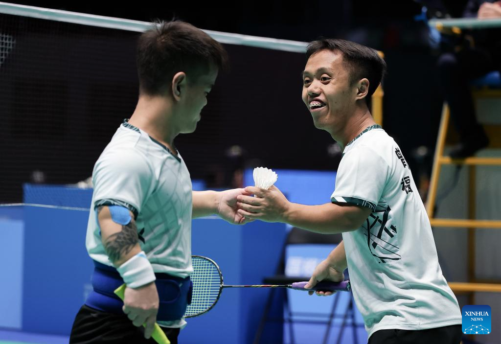 (251211) -- MACAO, Dec. 11, 2025 (Xinhua) -- Chen Pengfei (R)/Huang Qiyu of Fujian compete during the men's doubles SL3-SL4 group 2 match of para badminton at China's 12th National Games for Persons with Disabilities and the 9th National Special Olympic Games in Macao, China, Dec. 11, 2025. (Xinhua/Mao Siqian)