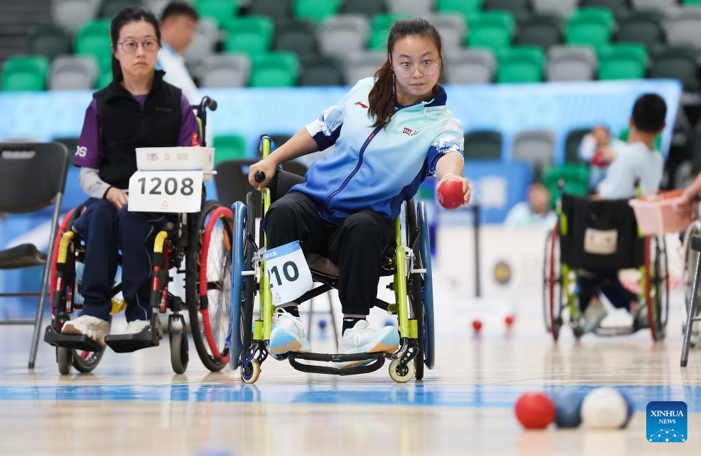 Zhan Xia (R) of Guangdong competes during the women's individual BC4 semifinals of boccia at China's 12th National Games for Persons with Disabilities and the 9th National Special Olympic Games in Hong Kong, south China, Dec. 11, 2025. (Xinhua/Lu Hanxin)