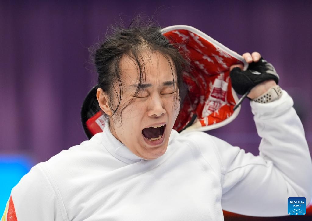 Ao Lanzhu of Shanghai celebrates after winning the women's epee individual category B semifinals of wheelchair fencing at China's 12th National Games for Persons with Disabilities and the 9th National Special Olympic Games in Hong Kong, south China, Dec. 11, 2025. (Xinhua/Hou Jun)