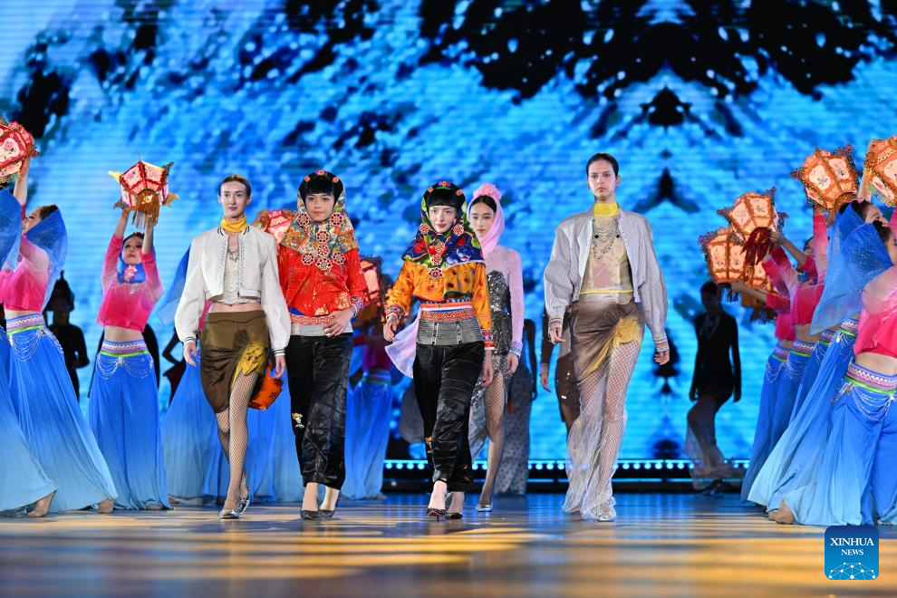 Models and actresses perform a fashion show of intangible cultural heritage at the opening ceremony of the 2025 Maritime Silk Road International Cultural Tourism Festival in Quanzhou, southeast China's Fujian Province, on Dec. 11, 2025. (Xinhua/Jiang Kehong)