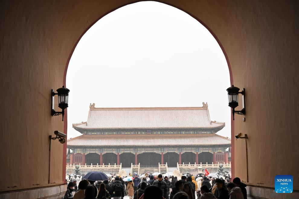 Tourists visit the Palace Museum amid snowfall in Beijing, China, Dec. 12, 2025. Beijing witnessed its first significant snowfall of this winter season on Friday. (Xinhua/Li Xin)