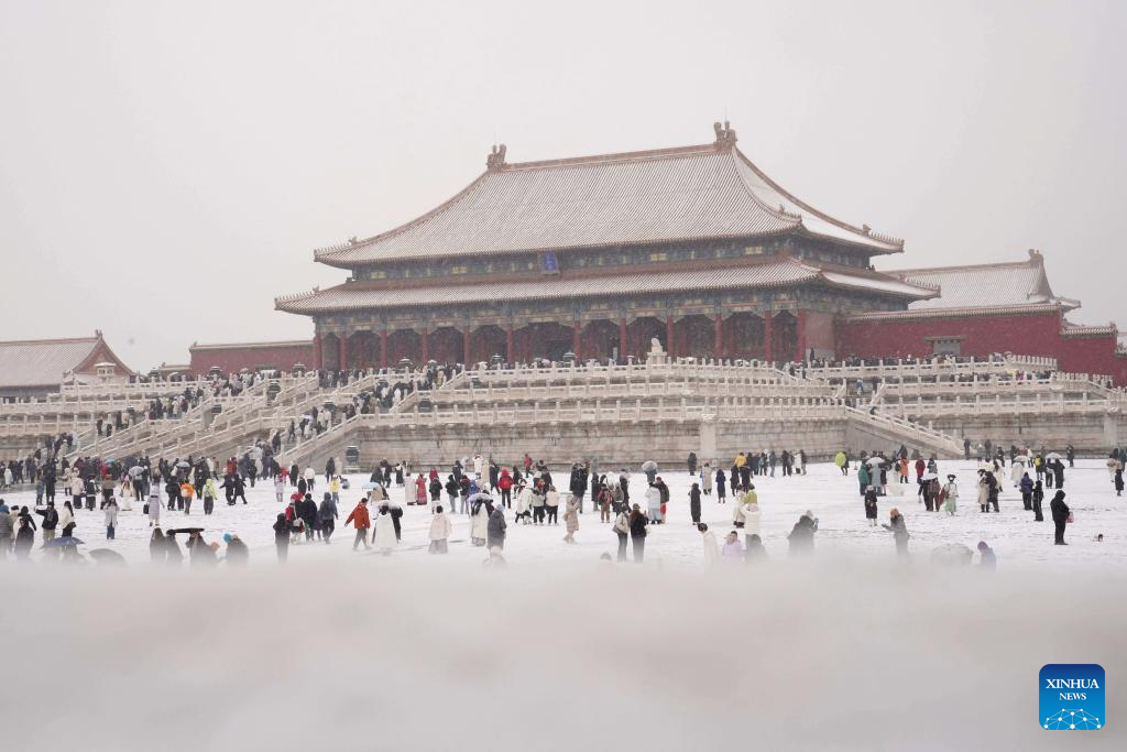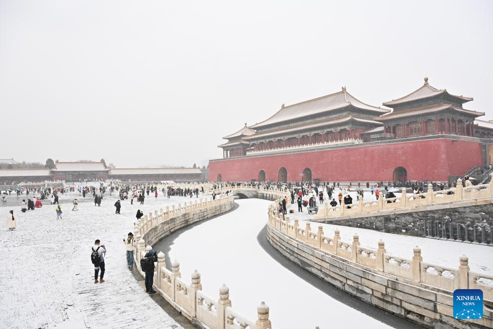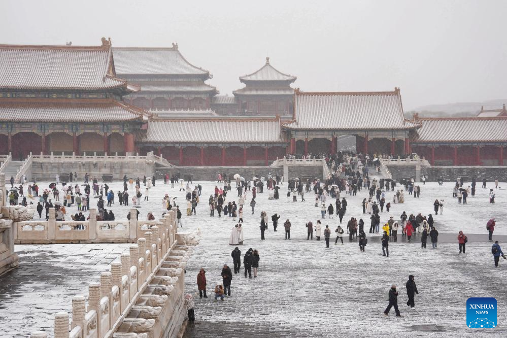 Tourists visit the Palace Museum amid snowfall in Beijing, capital of China, Dec. 12, 2025. Beijing witnessed its first significant snowfall of this winter season on Friday. (Photo by Wang Jin/Xinhua)