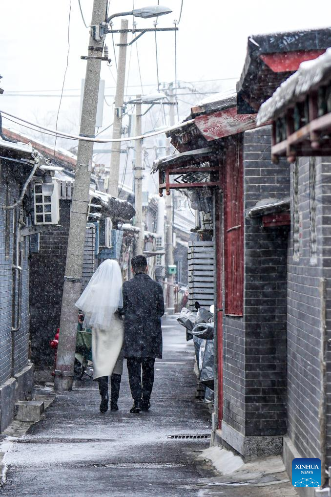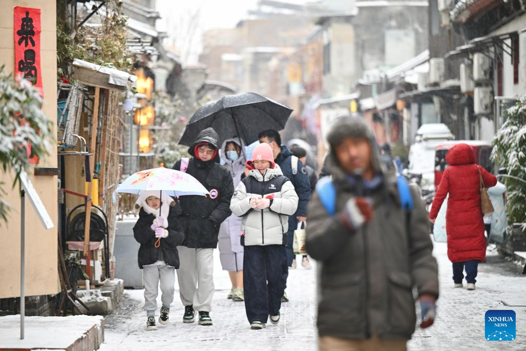 Pedestrians walk amid snowfall in Beijing, capital of China, Dec. 12, 2025. Beijing witnessed its first significant snowfall of this winter season on Friday. (Xinhua/Chen Yehua)