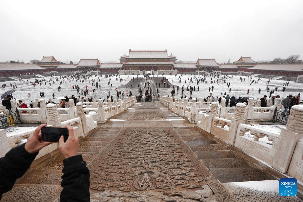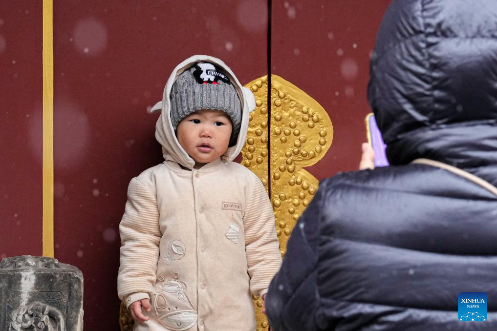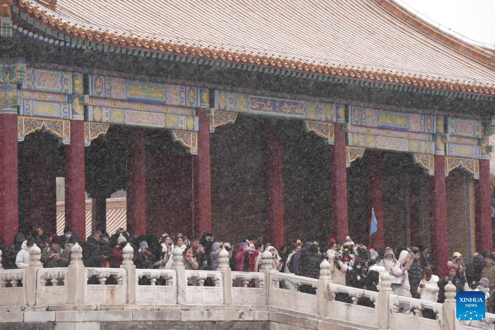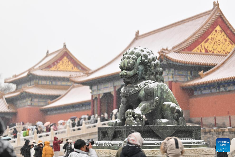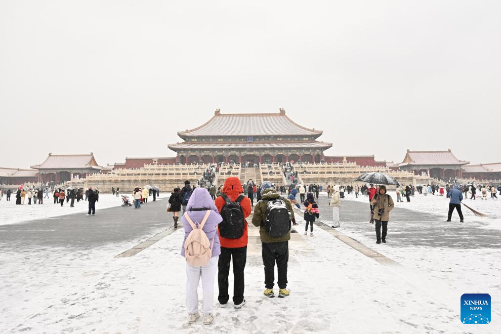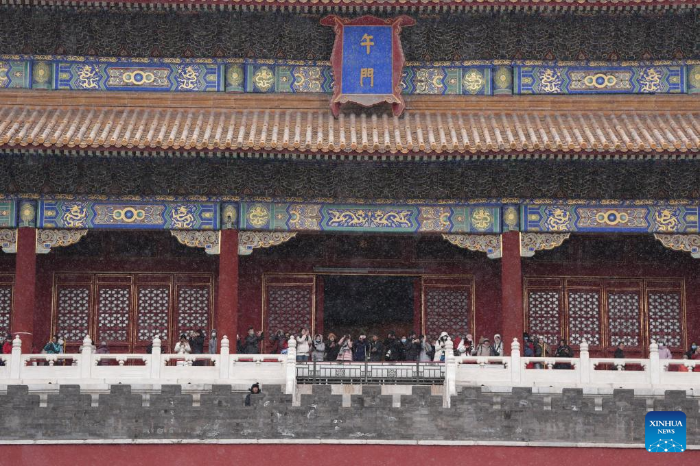 Tourists visit the Palace Museum amid snowfall in Beijing, capital of China, Dec. 12, 2025. Beijing witnessed its first significant snowfall of this winter season on Friday. (Xinhua/Li Xin)