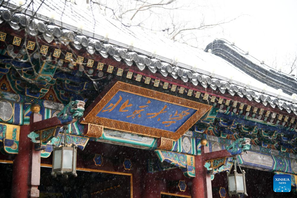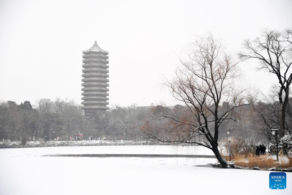 This photo taken on Dec. 12, 2025 shows a view of Peking University amid snowfall in Beijing, capital of China. Beijing witnessed its first significant snowfall of this winter season on Friday. (Xinhua/Ren Chao)