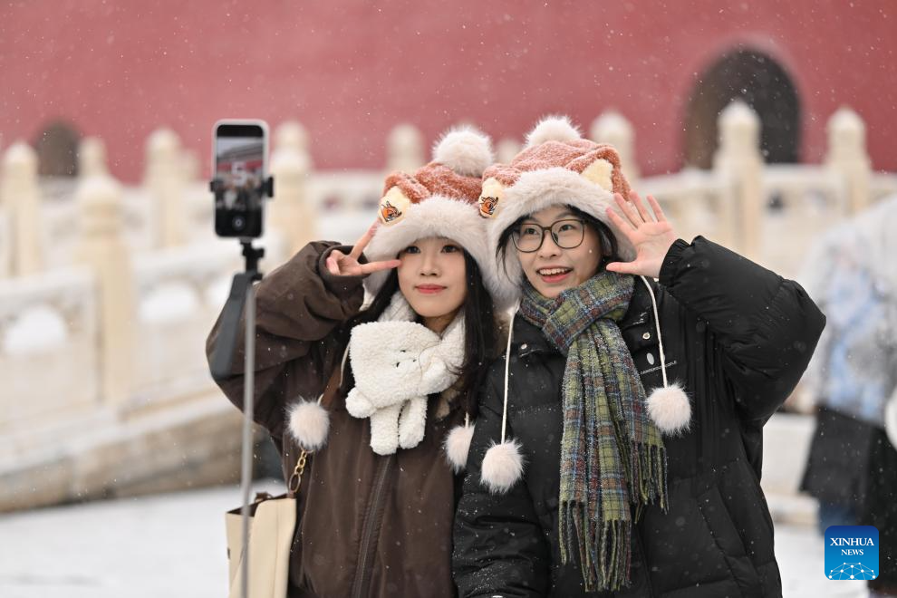 A tourist poses for a selfie amid snowfall outside the Palace Museum in Beijing, China, Dec. 12, 2025. Beijing witnessed its first significant snowfall of this winter season on Friday. (Xinhua/Li Xin)