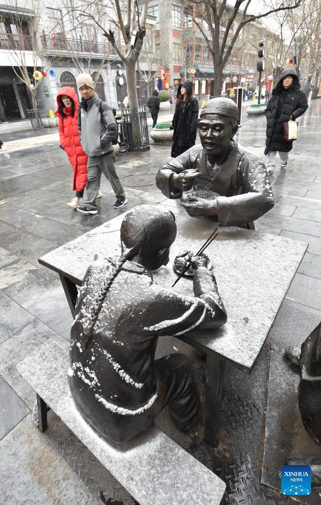 This photo taken on Dec. 12, 2025 shows a view at the Qianmen pedestrian street amid snowfall in Beijing, capital of China. Beijing witnessed its first significant snowfall of this winter season on Friday. (Xinhua/Li Xin)