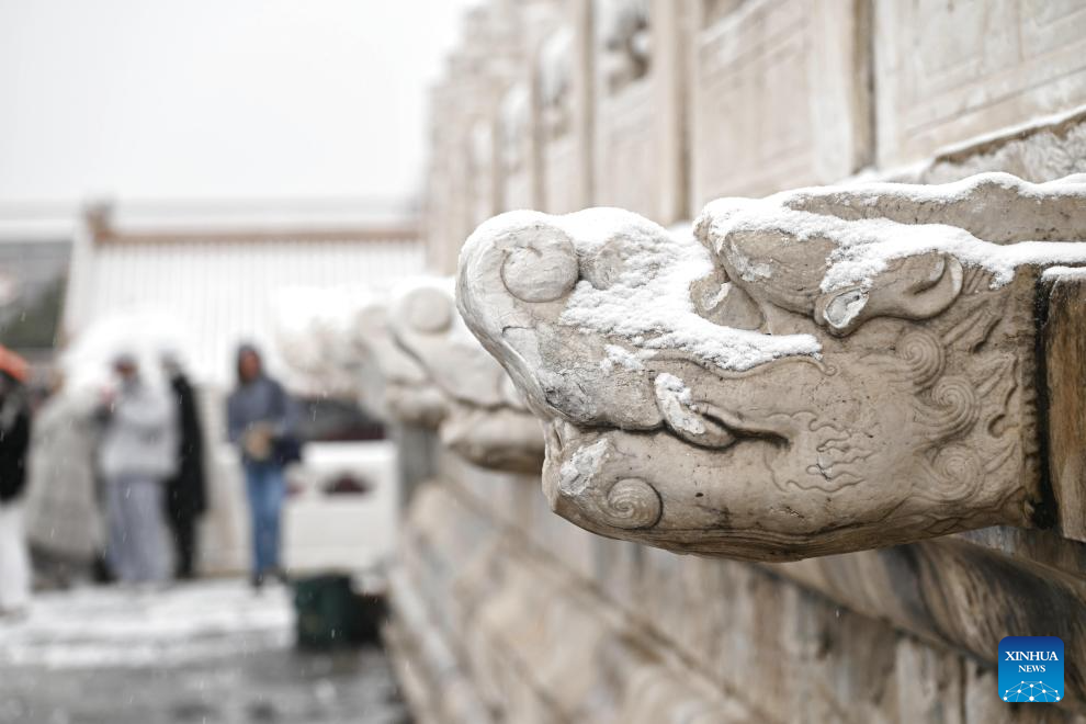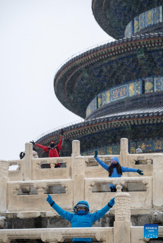 Tourists visit the Tiantan (Temple of Heaven) Park amid snowfall in Beijing, capital of China, Dec. 12, 2025. Beijing witnessed its first significant snowfall of this winter season on Friday. (Xinhua/Hu Jingwen)