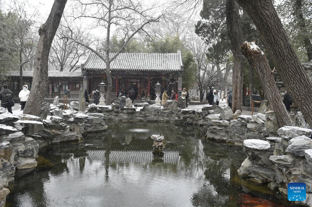 Tourists visit the Museum of Chinese Gardens and Landscape Architecture amid snowfall in Beijing, China, Dec. 12, 2025. Beijing witnessed its first significant snowfall of this winter season on Friday. (Xinhua/Zhang Cheng)