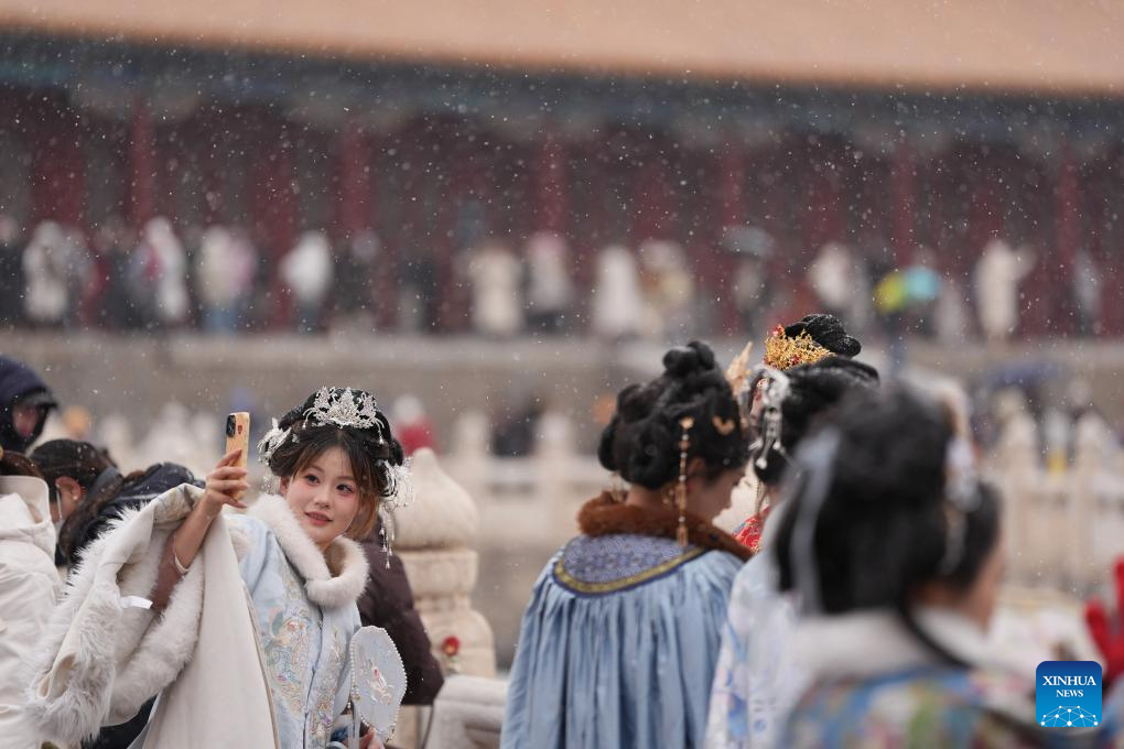 Tourists in traditional costumes pose for photos amid snowfall outside the Palace Museum in Beijing, China, Dec. 12, 2025. Beijing witnessed its first significant snowfall of this winter season on Friday. (Xinhua/Yin Dongxun)