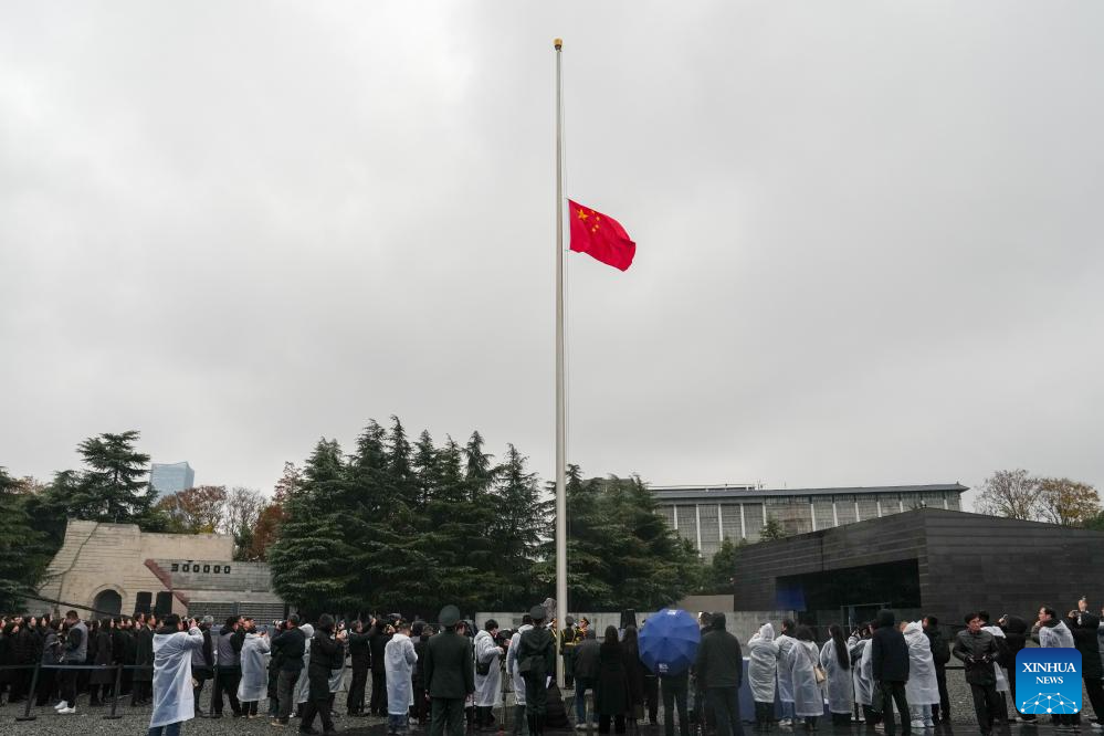 A flag-raising ceremony and a ceremony to lower the China's national flag at half mast are held at the Memorial Hall of the Victims in Nanjing Massacre by Japanese Invaders in Nanjing, capital of east China's Jiangsu Province, Dec. 13, 2025. Saturday marks the 12th national memorial ceremony for the Nanjing Massacre victims. (Xinhua/Li Bo)