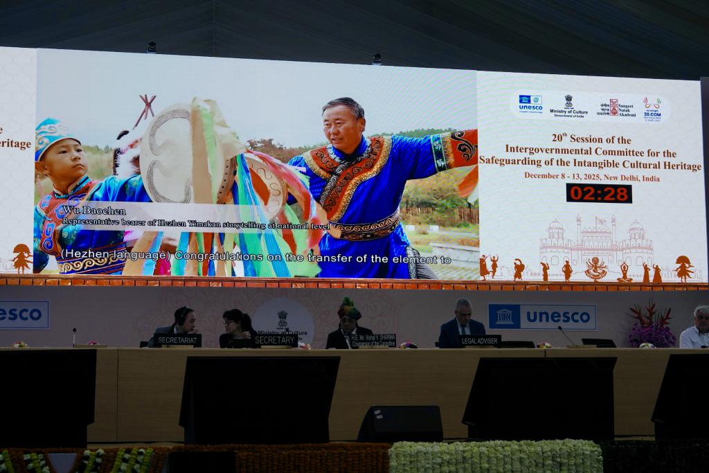 A video on the protection achievements of China's "Hezhen Yimakan storytelling" is played during the 20th regular session of the Intergovernmental Committee for the Safeguarding of the Intangible Cultural Heritage in New Delhi, India, Dec. 11, 2025. (Xinhua/Wu Yue)