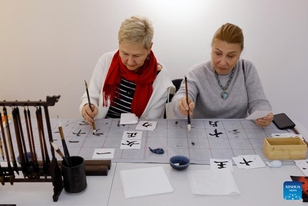 Guests try Chinese traditional calligraphy during the opening day of the 4th edition of the Buchina Book Fair at the China Cultural Center in Bucharest, Romania, Dec. 13, 2025. Buchina is a book fair dedicated to Chinese literature, culture and art. (Photo by Cristian Cristel/Xinhua)